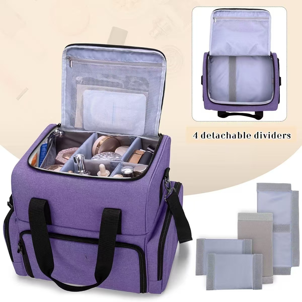 with 3 detachable dividers which makes it easy to keep cosmetics organized. The bottom contains 3