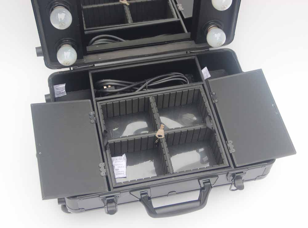Crafted from durable aluminum, this makeup case ensures the safety of your valuable beauty products. Its black finish exudes sophistication, making it a fashion statement in itself. The built-in LED lights offer perfect lighting conditions for flawless makeup application, even in dimly lit environments.