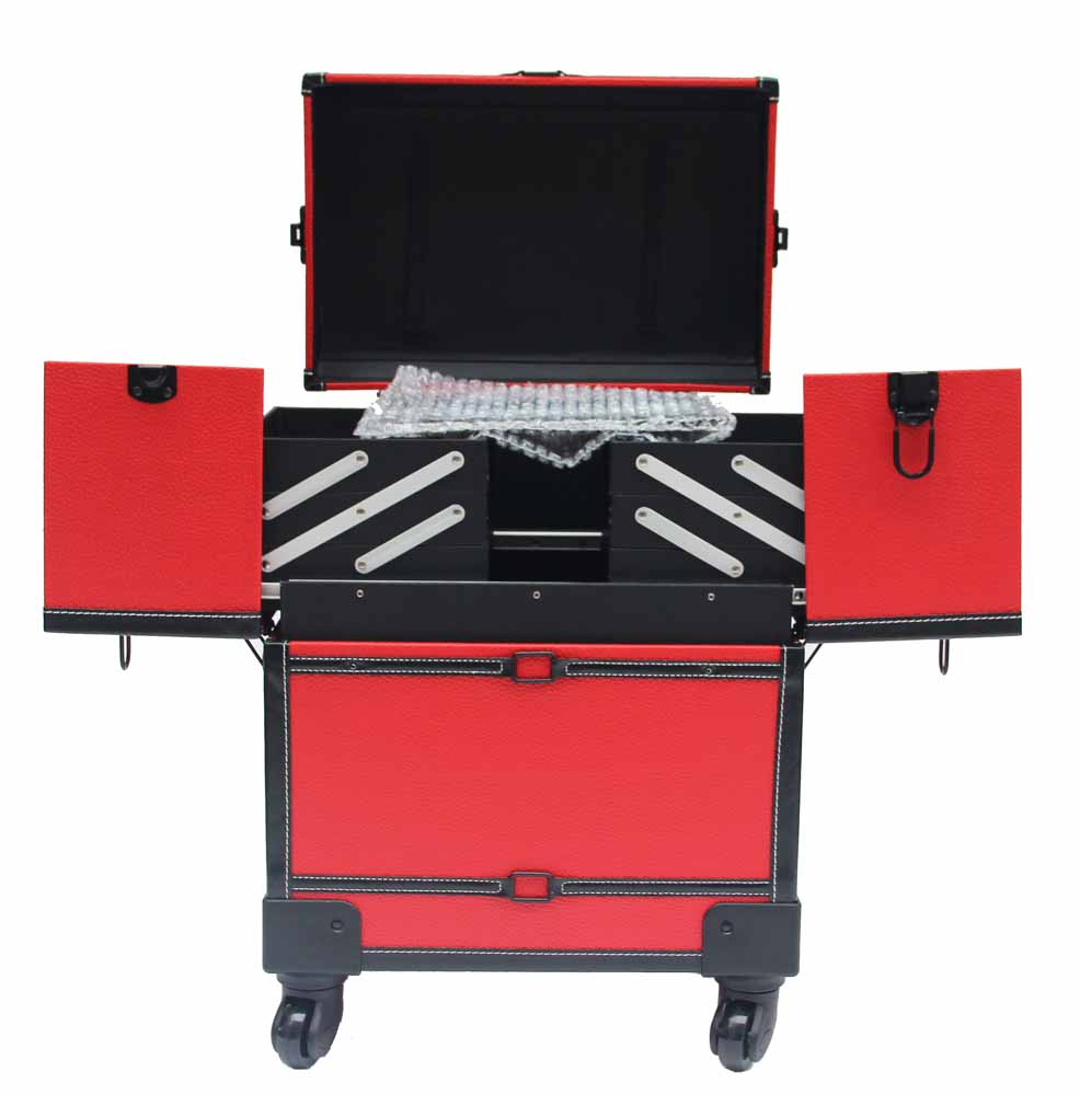 Designed for convenience, this trolley case includes a top-opening lid for quick access to frequently used products, along with secure zippers and reinforced corners for added protection. The bold red and black color scheme ensures a standout appearance, reflecting professionalism and sophistication.